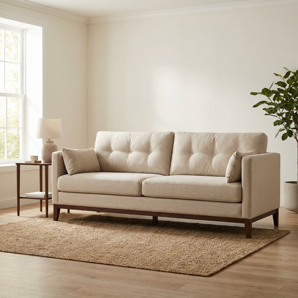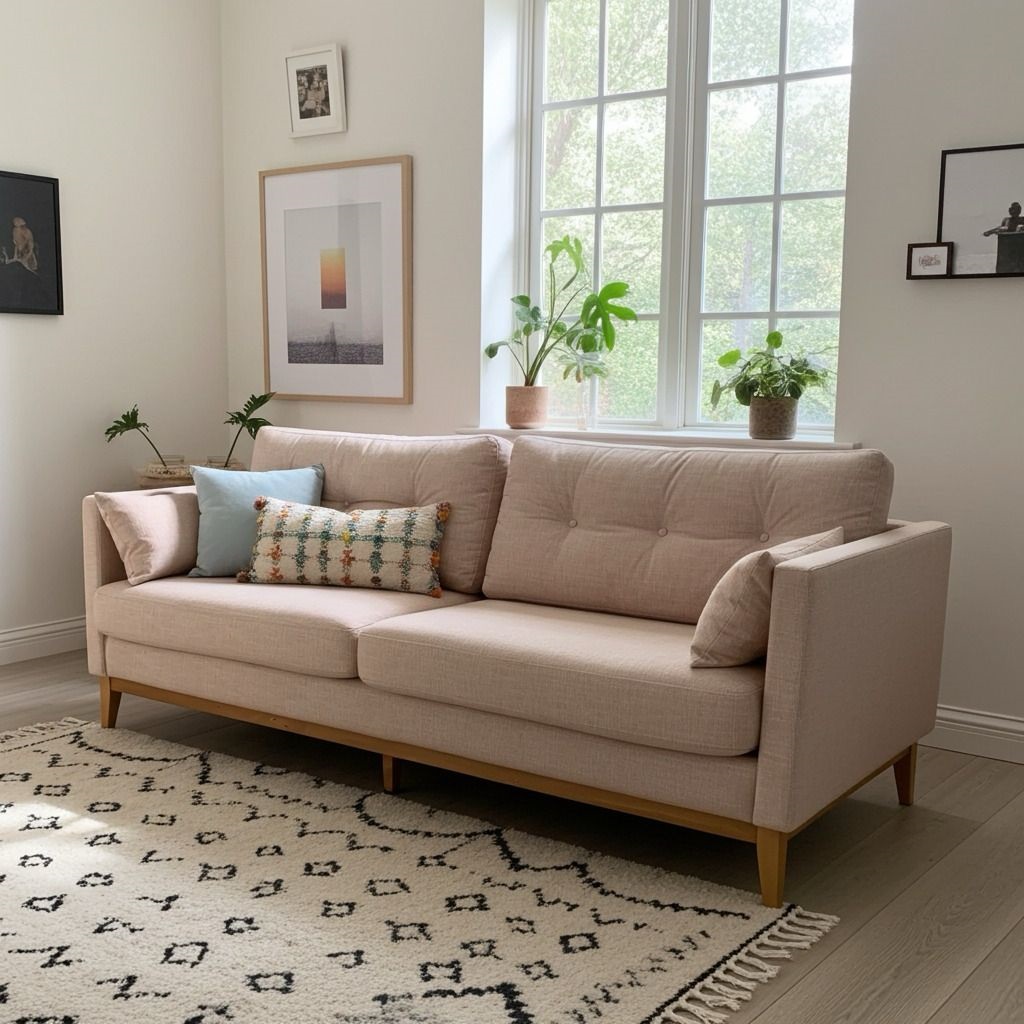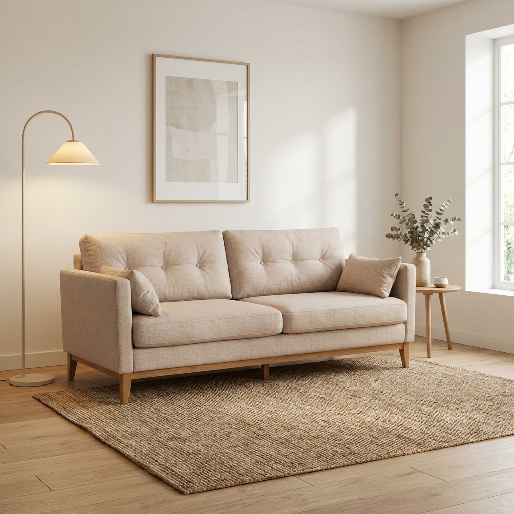 Delicado e acolhedor, com design moderno e pés em madeira que trazem leveza ao ambiente. As almofadas complementam o visual e garantem conforto, tornando-o perfeito para criar um espaço aconchegante e elegante.